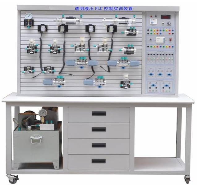 1、透明液压PLC控制实训装置主要由实训桌、实训台、液压元件和电器控制器件、可编程控制器(PLC)等组件组成。