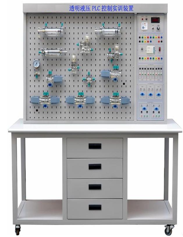 1、透明液压PLC控制实训装置主要由实训桌、实训台、液压元件和电器控制器件、可编程控制器(PLC)等组件组成。