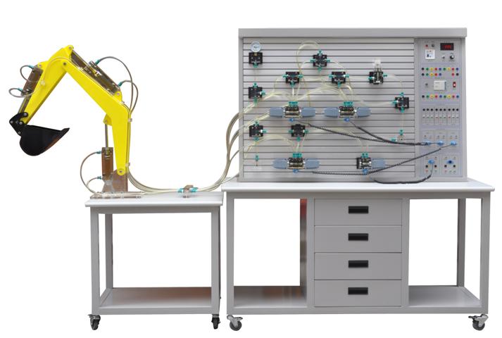 1、在原有透明液压PLC控制实训装置几十种基本回路上增加了可模拟真实挖掘机工作装置各种动作。