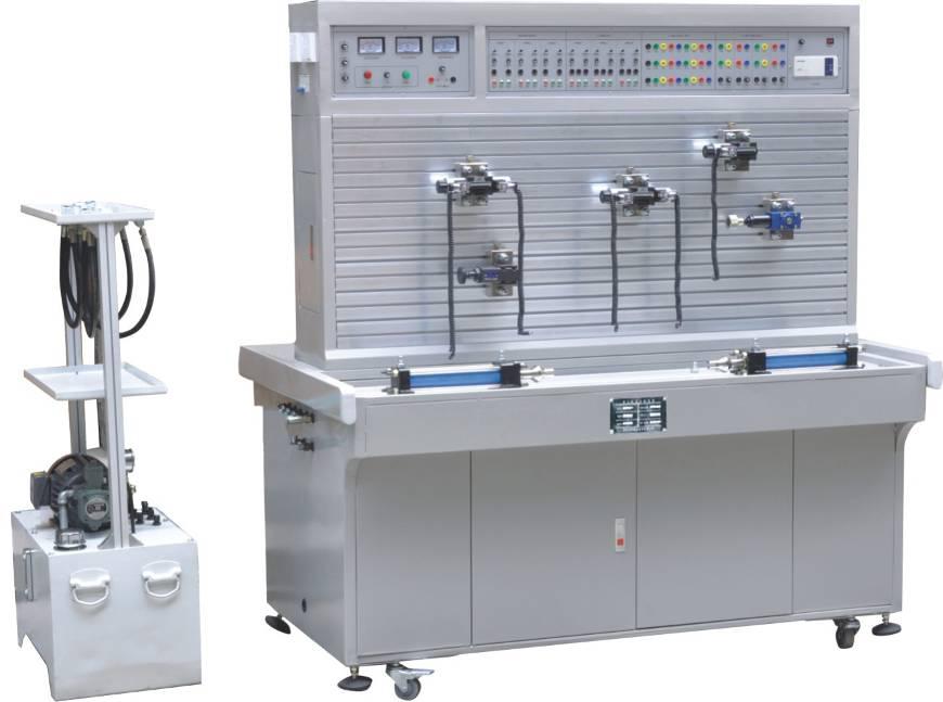 集真实的液压元件、各执行模块、继电器控制单元、PLC编程及控制技术于一体,液压元件成独立模块,均装有带弹性插脚的底板,实训时可在通用铝型材板上组装成各种液压系统回路,电机和泵轴承式连接(一体化)再和油箱固定在一起,油箱和控制屏单独放置;带有三相漏电保护,直流电源带有过流保护,系统额定压力为6.3Mpa。